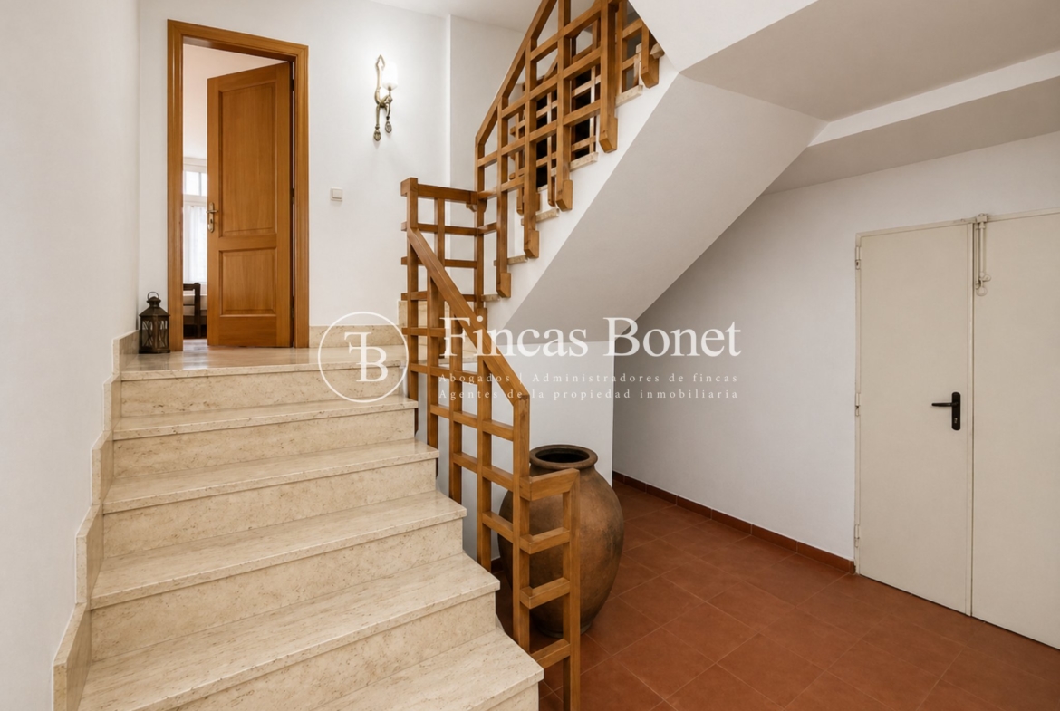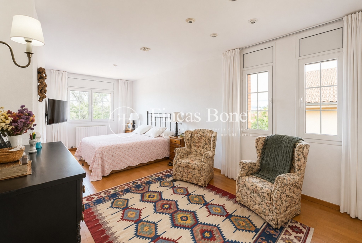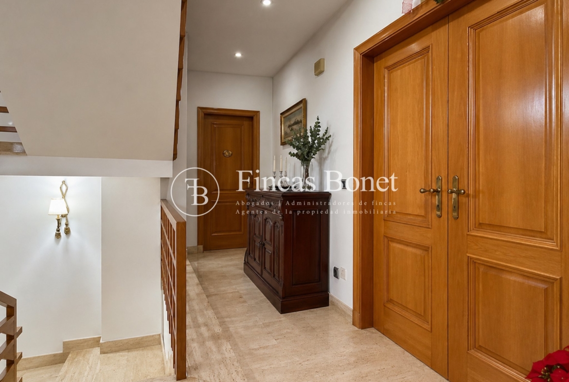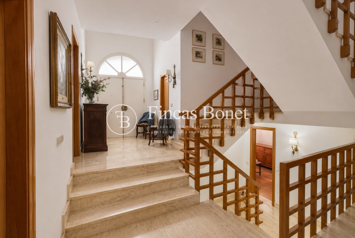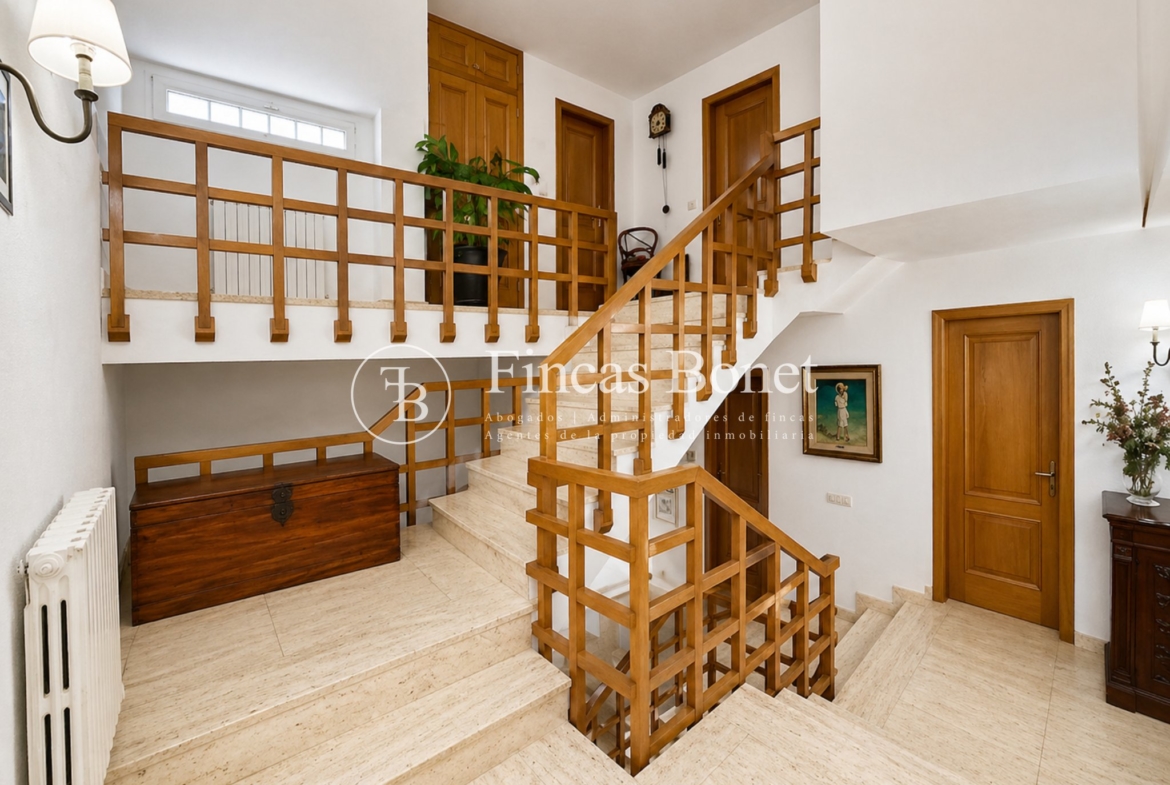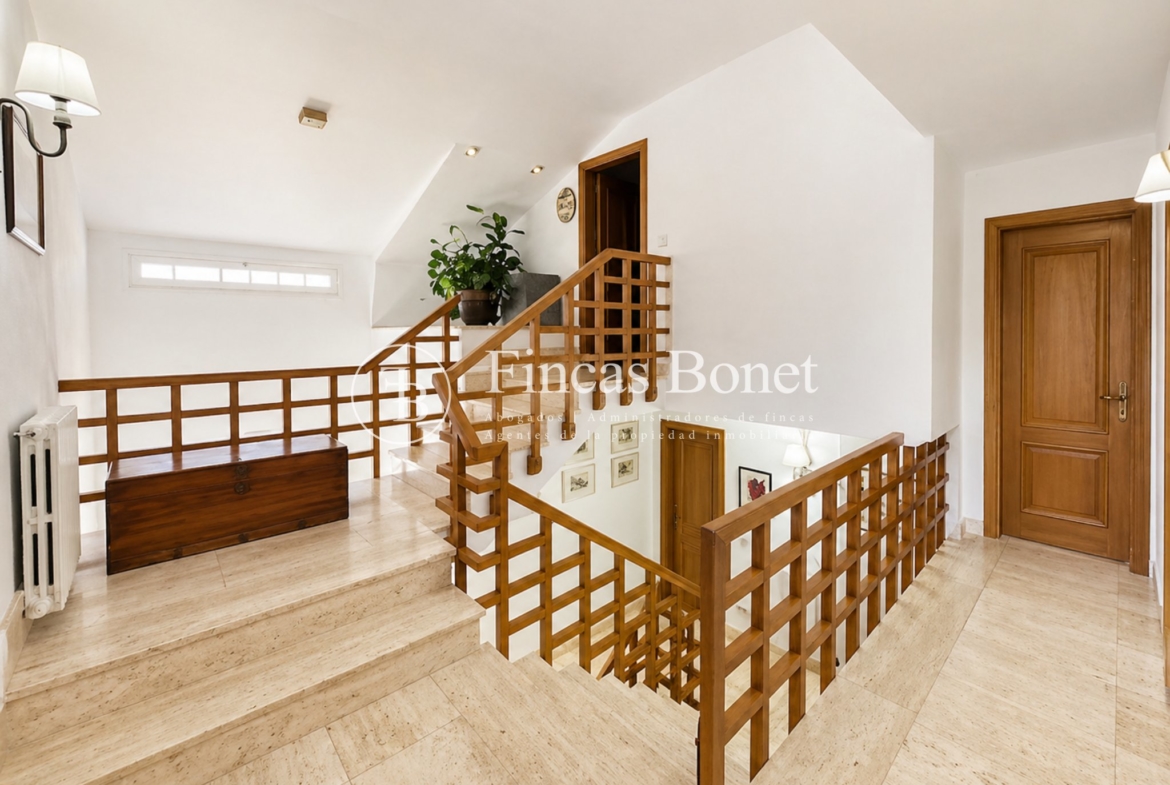 Mediante espectacular escalera interior accedemos a los cinco dormitorios y cinco baños, lo que da comodidad para familias numerosas o para recibir invitados. La habitación principal tipo suite, con mayor dimensión y baño integrado, generando un espacio más reservado dentro del conjunto.