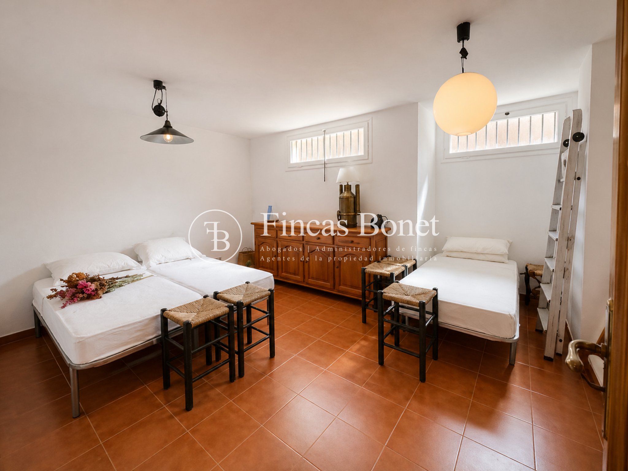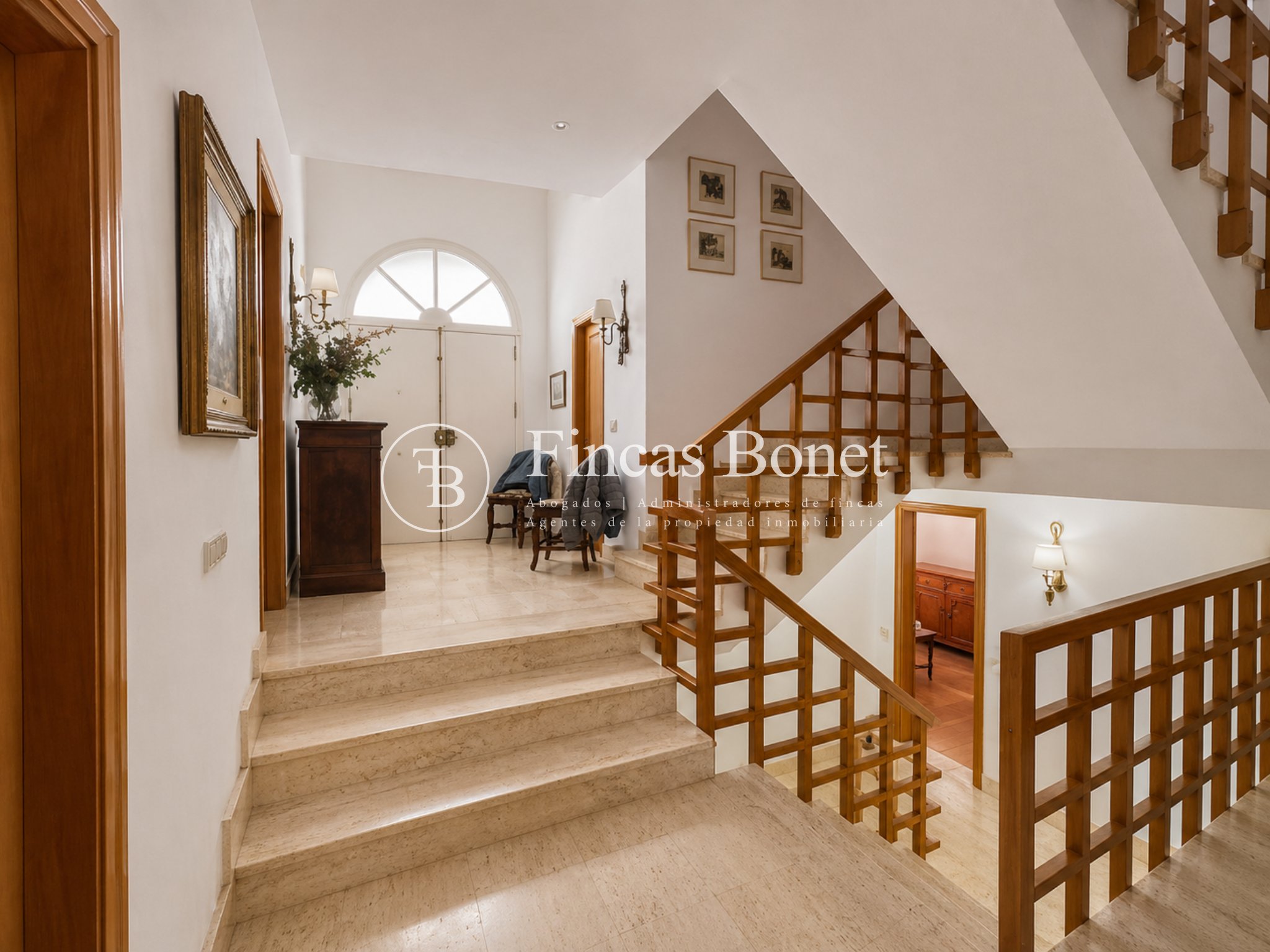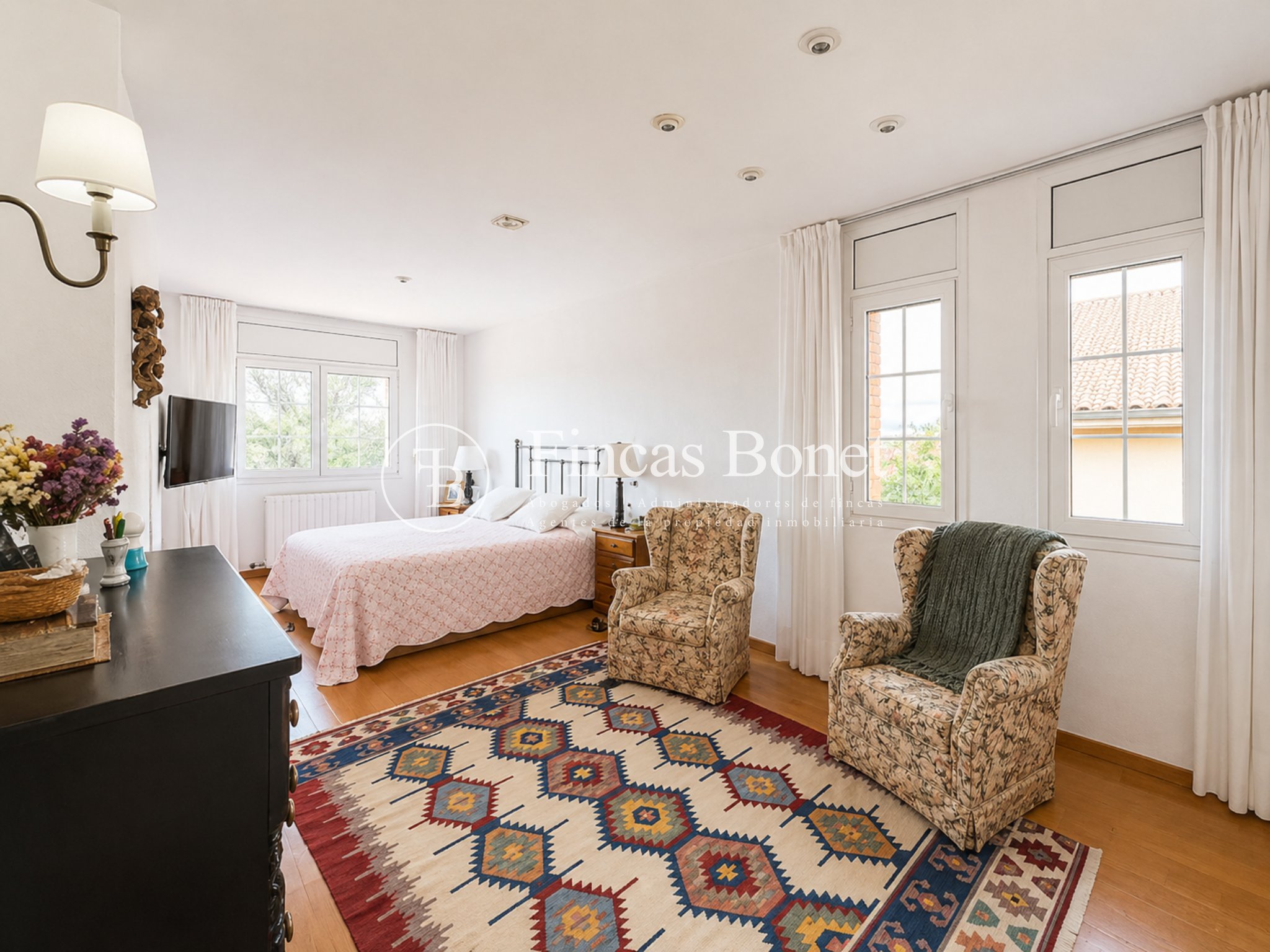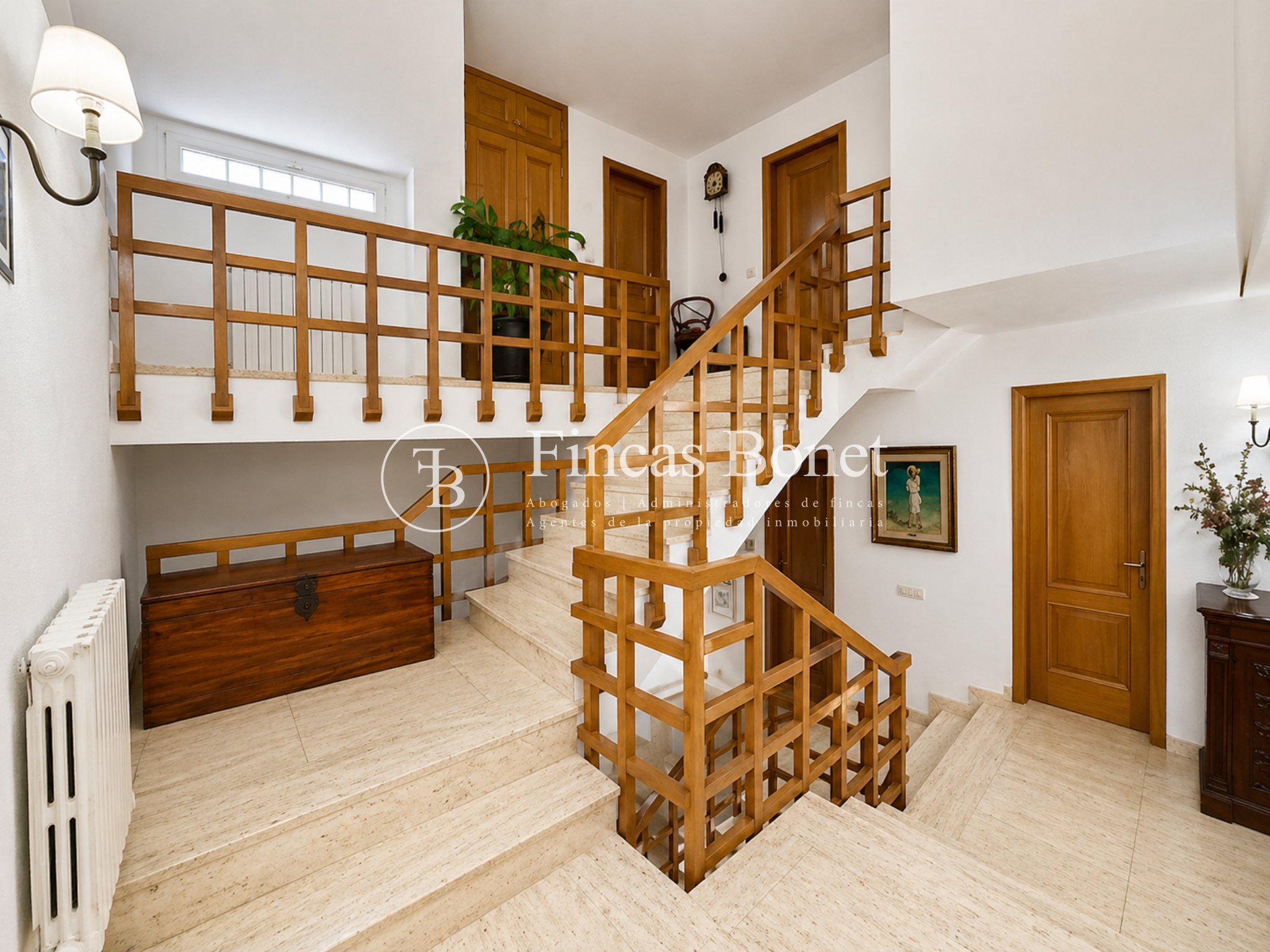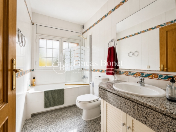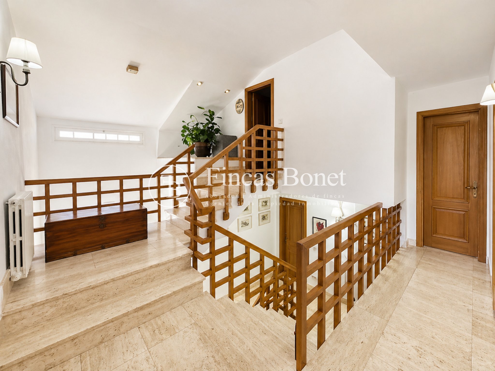 Mediante espectacular escalera interior accedemos a los cinco dormitorios y cinco baños, lo que da comodidad para familias numerosas o para recibir invitados. La habitación principal tipo suite, con mayor dimensión y baño integrado, generando un espacio más reservado dentro del conjunto.