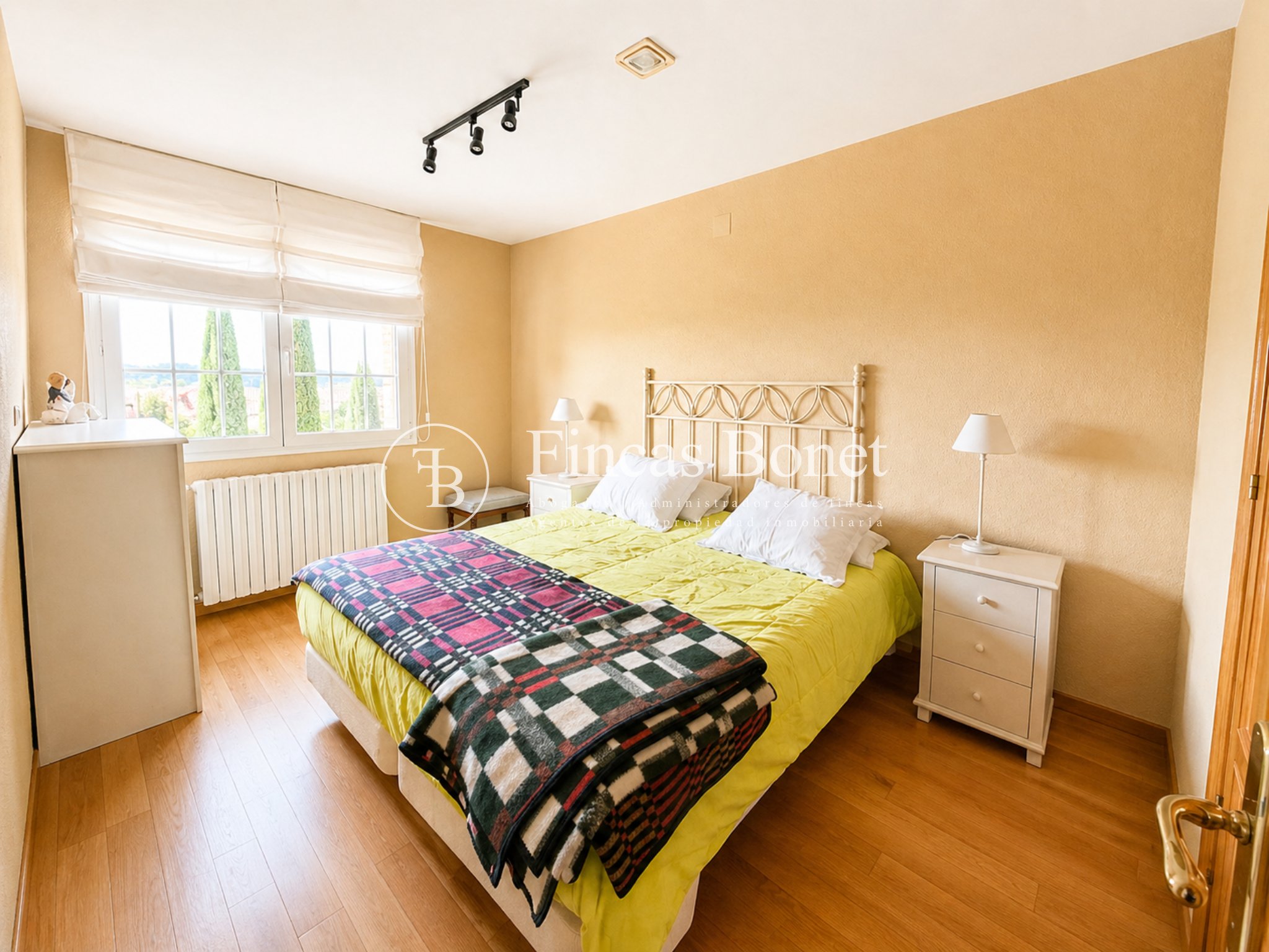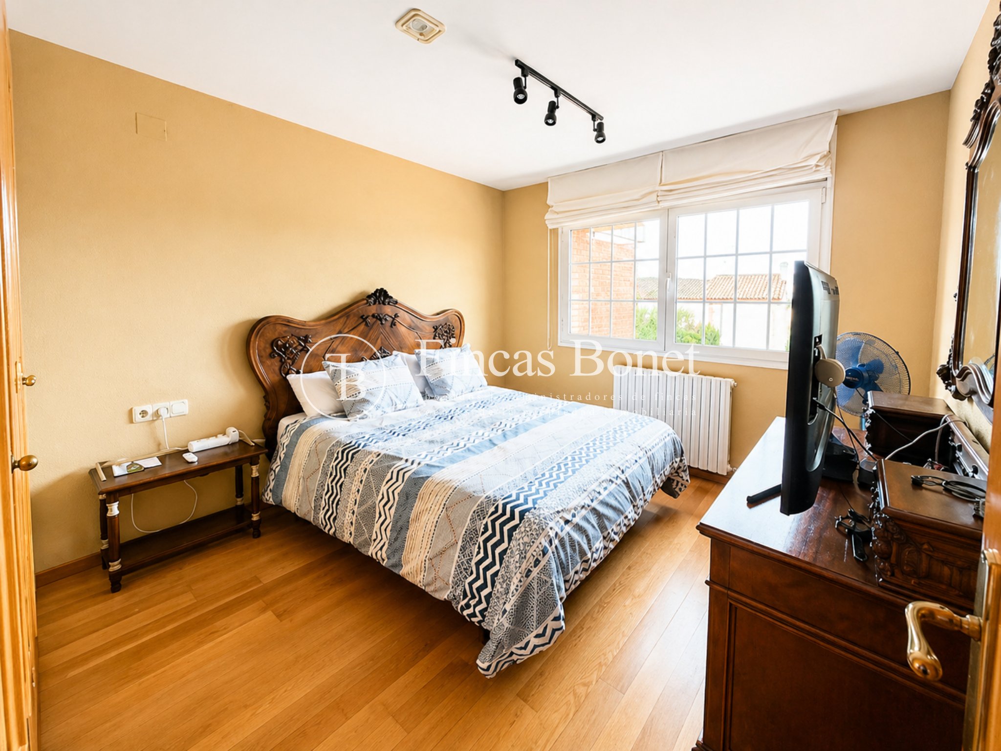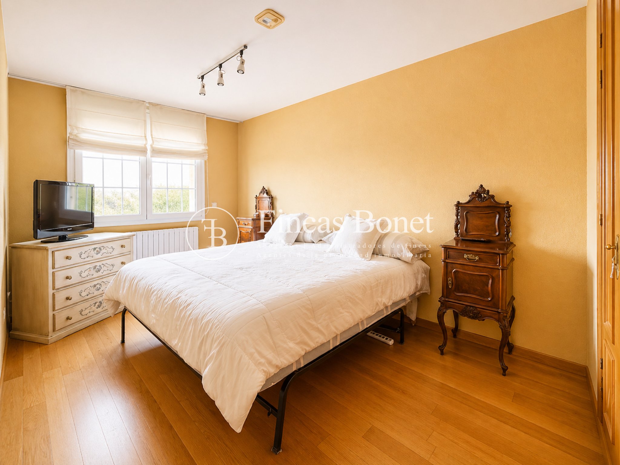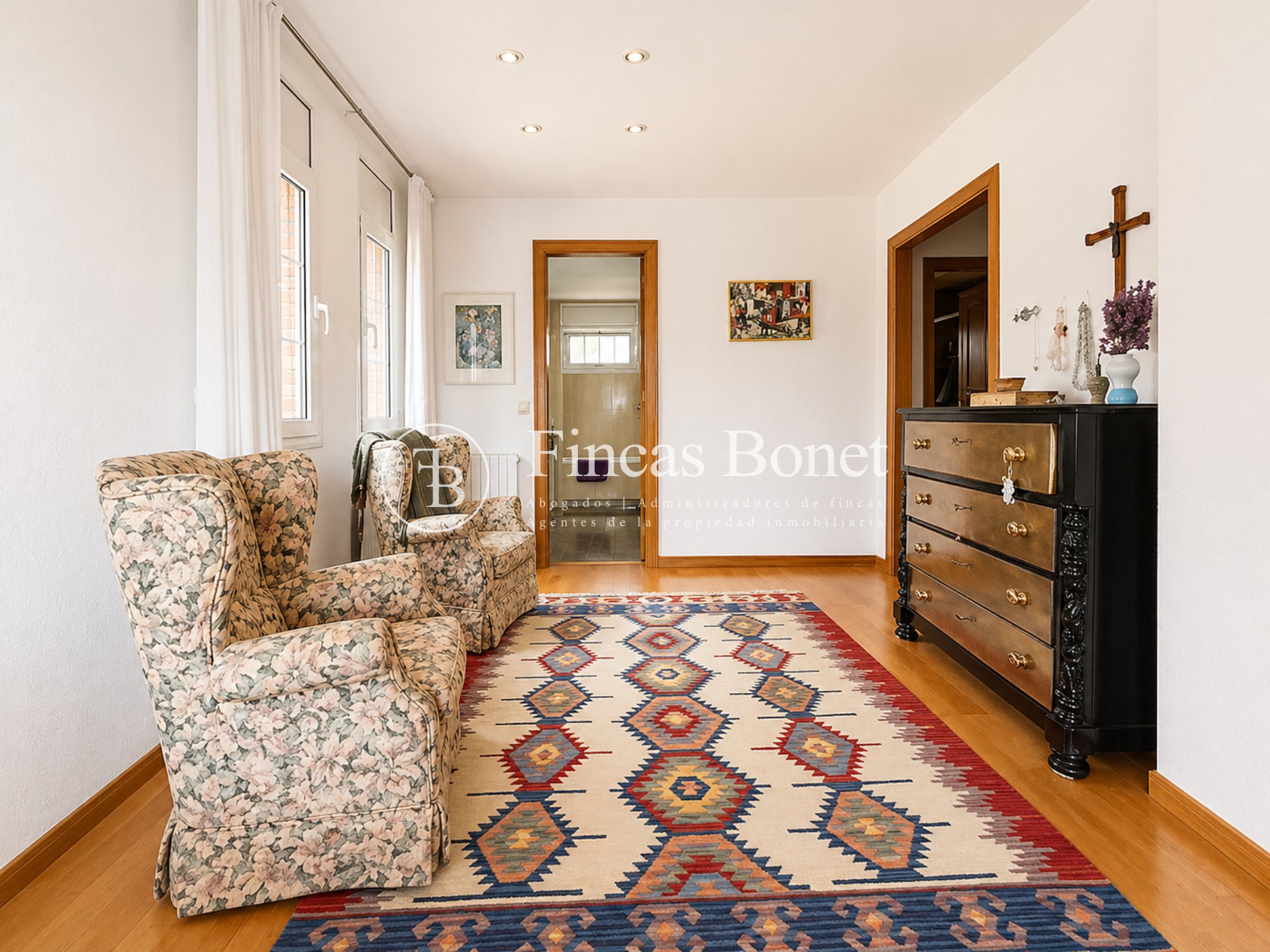 Mediante espectacular escalera interior accedemos a los cinco dormitorios y cinco baños, lo que da comodidad para familias numerosas o para recibir invitados. La habitación principal tipo suite, con mayor dimensión y baño integrado, generando un espacio más reservado dentro del conjunto.