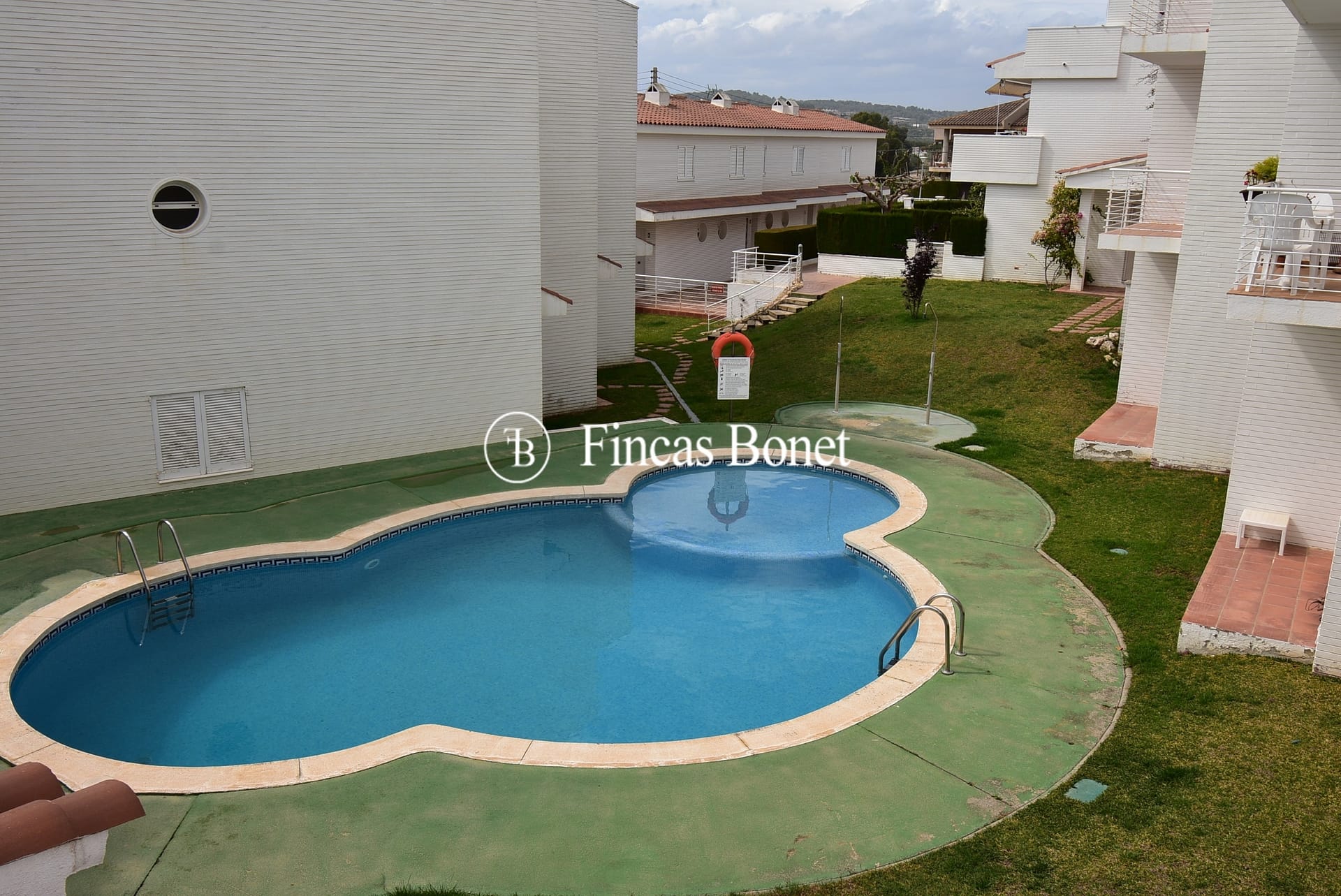 Tiene zona comunitaria con piscina, duchas y cesped.